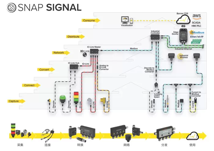 轻松实现IIoT,细数Snap Signal如何释放工厂的真正潜力——Snap Signal是IIoT模块化软硬件的完整组合,易于部署,能在整个工厂提供可执行的机器数据。Snap Signal不仅仅是另一种形式的IIoT,而是一种几乎可以从所有来源捕获数据信号的覆盖网络。它将这些信号源无缝转换为单一的工业标准协议,然后分发数据,以便快速方便地使用。通过Snap Signal可以灵活监测一个区域内的关键设备,也可以监测整个设施。