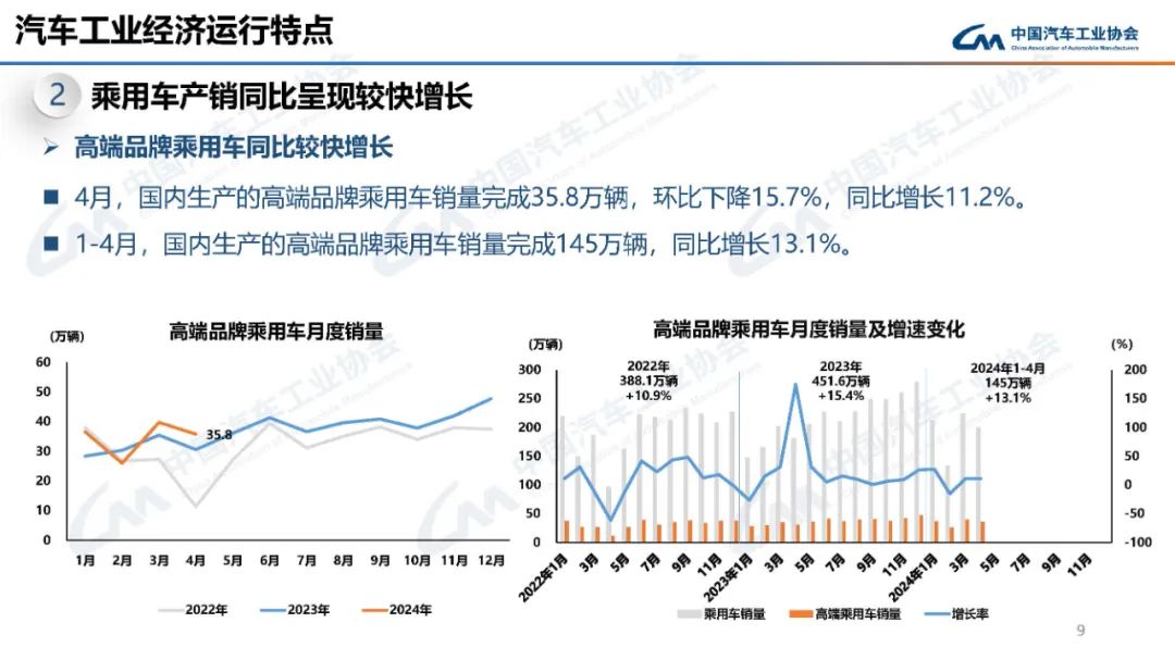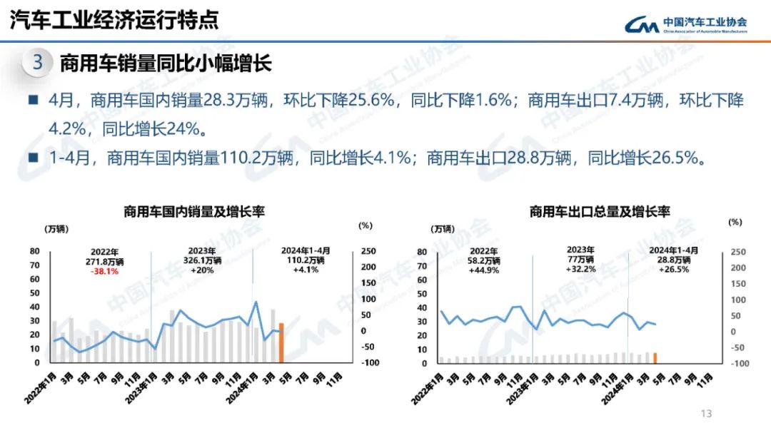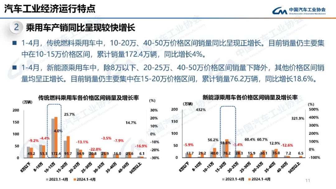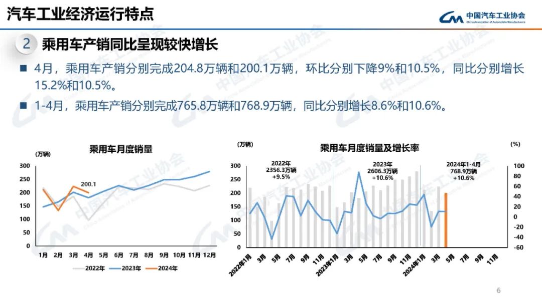 总体来看,2024年4月份我国汽车行业大致呈现以下的运行特点:汽车产销同比呈现较快增长、乘用车产销同比呈现较快增长、新能源产销同比快速增长。