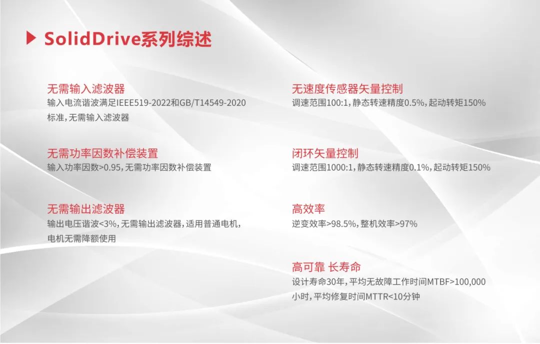 SolidDrive系列高压变频调速装置,业内率先采用无速度传感器矢量控制技术,搭载32位高速DSP实现全数字控制,融合先进大规模集成电路与全新IGBT功率器件。该装置采用单元串联多电平结构,一体化设计提高产品可靠性。输入端采用多重化隔离变压器减少谐波干扰,提高功率因数,并改善电网质量,符合IEEE及GB/T标准。输出采用多个功率单元移相PWM波形输出的串联叠加,获得多电平高电压,从而实现更低的输出电压谐波、共模电压和dv/dt。无需增加输出滤波装置,安全防护电机的绝缘和轴承,可以直接驱动各类异步电机和同步电机。产品电压等级2.3~13.8kV,功率范围涵盖220kW~35MW。