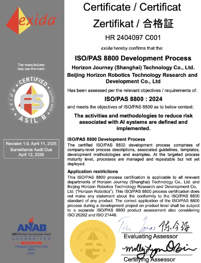 地平线荣获全球首张且唯一的ISO 8800道路车辆AI功能安全认证